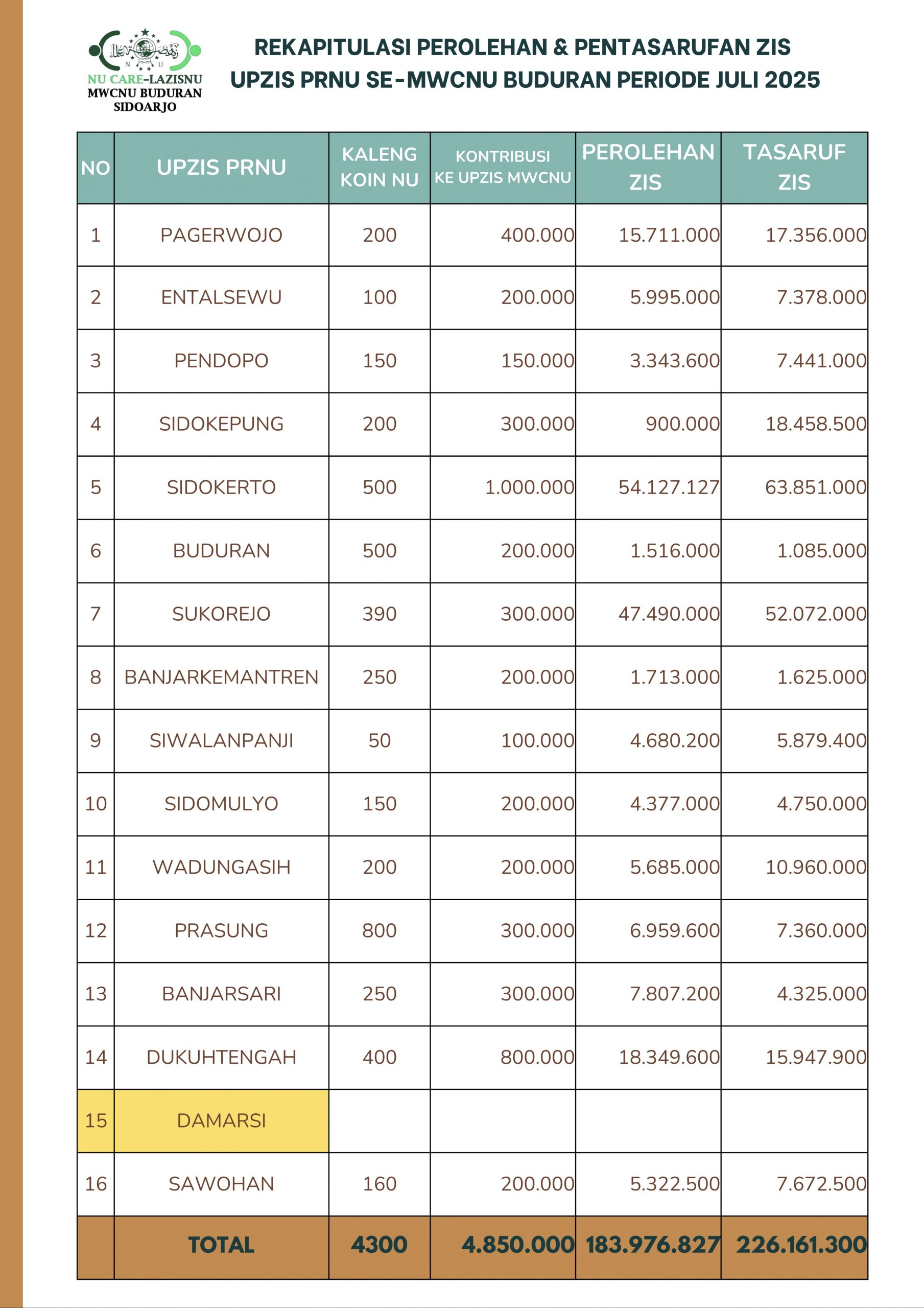 Keuangan Posisi Keuangan UPZIS se-MWCNU Buduran Periode Juli 2025 Posted: 29 September 2025 0 comments LAPORAN KEUANGAN JULI 2025 Posted: 23 September 2025 0 comments LAPORAN KEUANGAN PERIODE DESEMBER 2023 Posted: 21 Januari 2024 0 comments LAPORAN KEUANGAN PERIODE NOVEMBER 2023 Posted: 21 Januari 2024 0 comments Keuangan Periode Oktober 2023 Posted: 2 Desember 2023 0 comments Laporan Keuangan Periode Agustus-September 2023 Posted: 30 Oktober 2023 0 comments Rekap Perolehan ZIS Lazisnu PRNU se-MWCNU Buduran Periode Agustus – September 2023 Posted: 30 Oktober 2023 0 comments Realisasi Penghimpunan & Pentasarufan Semester I Tahun 2023 Posted: 23 Agustus 2023 0 comments Rekapitulasi Perolehan ZIS UPZIS se-Buduran periode Juli 2023 Posted: 23 Agustus 2023 0 comments Keuangan Bulan Juli 2023 Posted: 23 Agustus 2023 0 comments